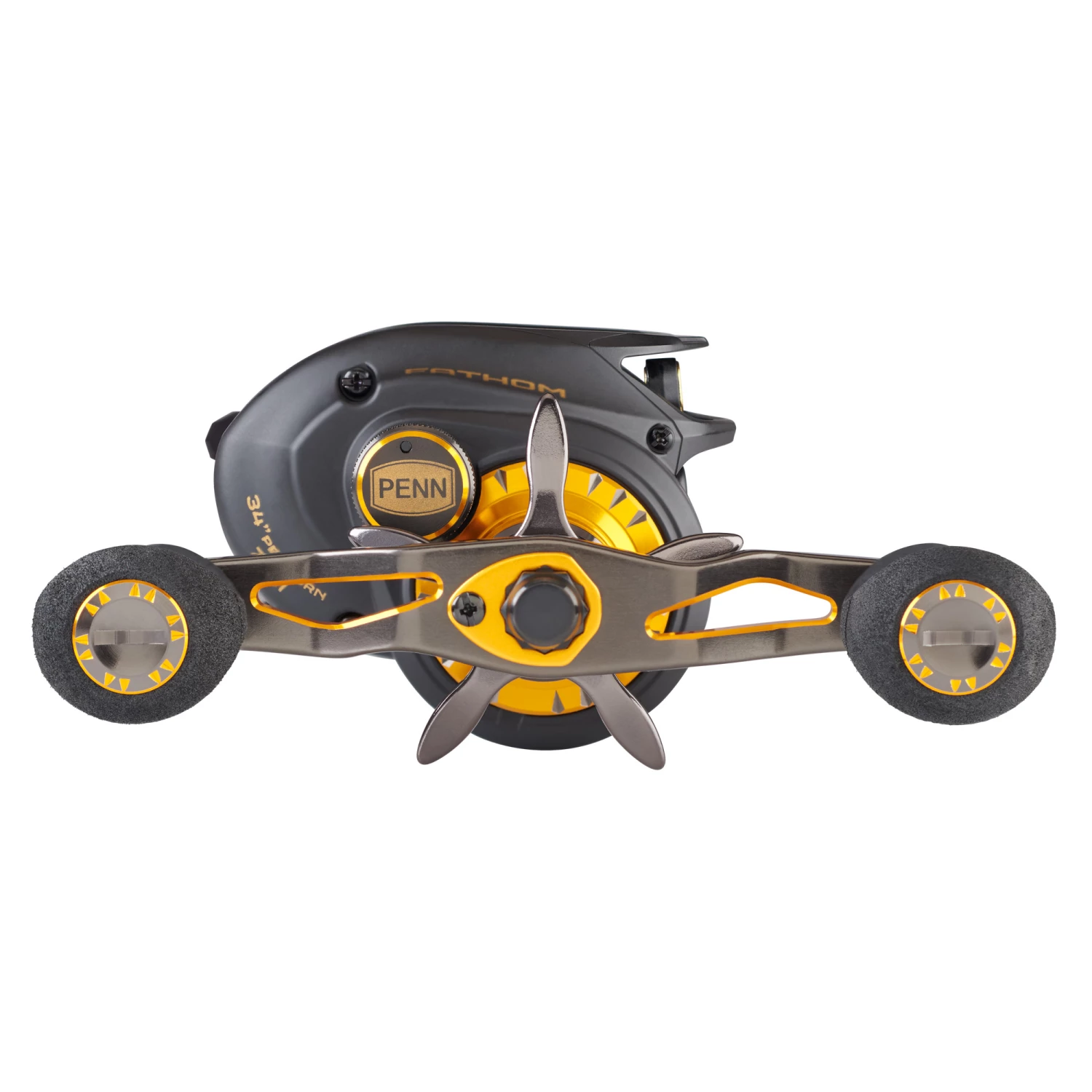 Fishing with the low-profile Penn Fathom baitcasting reel is a pleasure in both salt and fresh water. The Fathom features a metallic body and right-hand side plate. The sturdy housing protects brass gearing with a bronze pinion gear. This ensures ultimate reliability and smoothness in any situation.